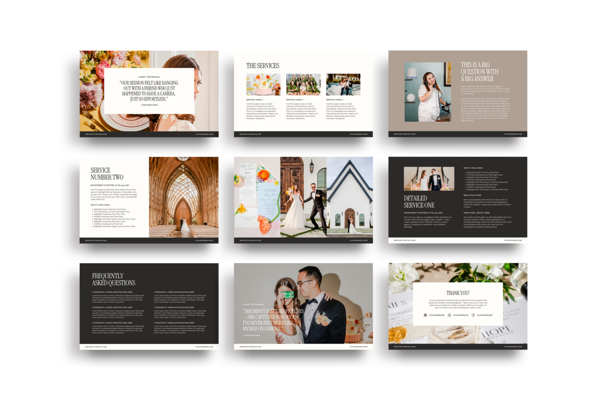 A Pricing & Services Guide bridges the gap between curiosity and commitment by presenting your offerings in a polished document that clients can save, print, and share with partners or other decision-makers. When used alongside our website templates, it creates a cohesive, elevated journey from first click to final contract. It’s also a great option if you prefer to reserve certain pricing and process details only with serious leads. This way, you maintain a high-touch brand experience while ensuring the inquiries that reach you are informed, aligned, and ready to say yes.