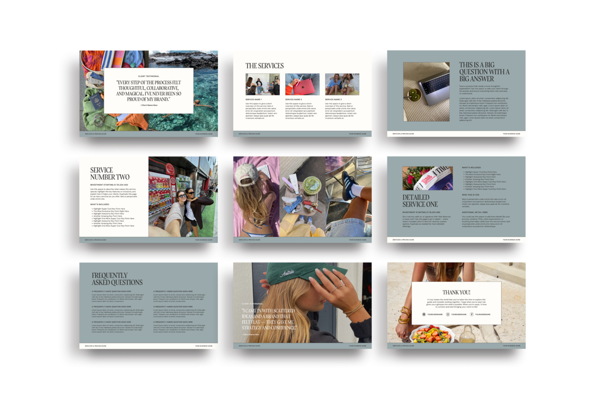 A Pricing & Services Guide bridges the gap between curiosity and commitment by presenting your offerings in a polished document that clients can save, print, and share with partners or other decision-makers. When used alongside our website templates, it creates a cohesive, elevated journey from first click to final contract. It’s also a great option if you prefer to reserve certain pricing and process details only with serious leads. This way, you maintain a high-touch brand experience while ensuring the inquiries that reach you are informed, aligned, and ready to say yes.