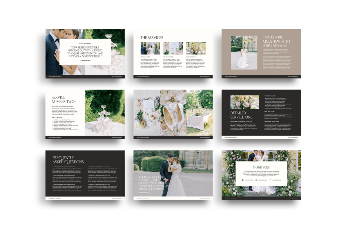 A Pricing & Services Guide bridges the gap between curiosity and commitment by presenting your offerings in a polished document that clients can save, print, and share with partners or other decision-makers. When used alongside our website templates, it creates a cohesive, elevated journey from first click to final contract. It’s also a great option if you prefer to reserve certain pricing and process details only with serious leads. This way, you maintain a high-touch brand experience while ensuring the inquiries that reach you are informed, aligned, and ready to say yes.